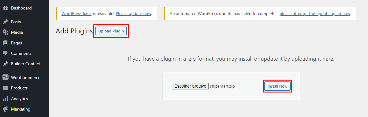 In the Add Plugins section, click on “Upload Plugin” and select the .zip file of the ShipSmart plugin you downloaded (file available here).