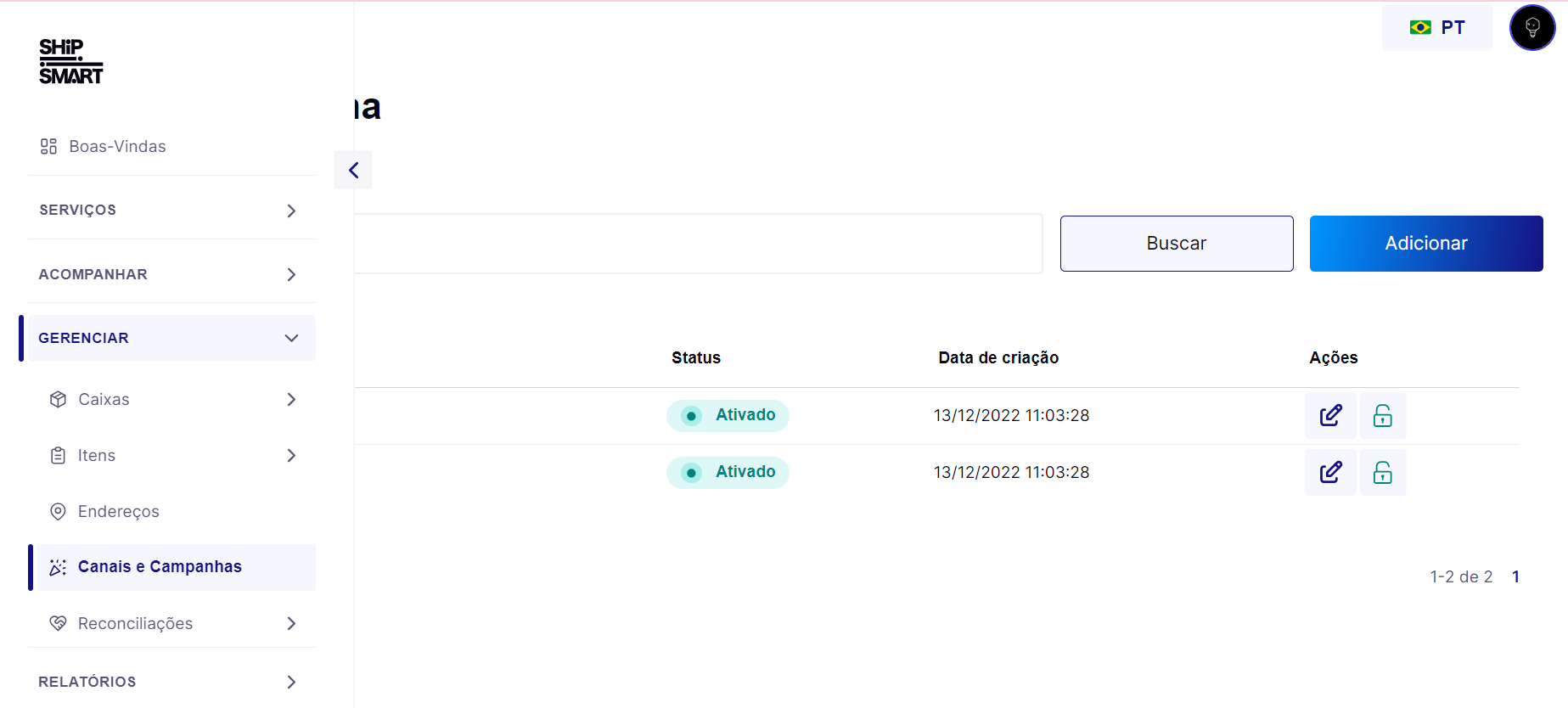 Isso te levará para a página de gerenciamento dos seus Canais e Campanhas:
