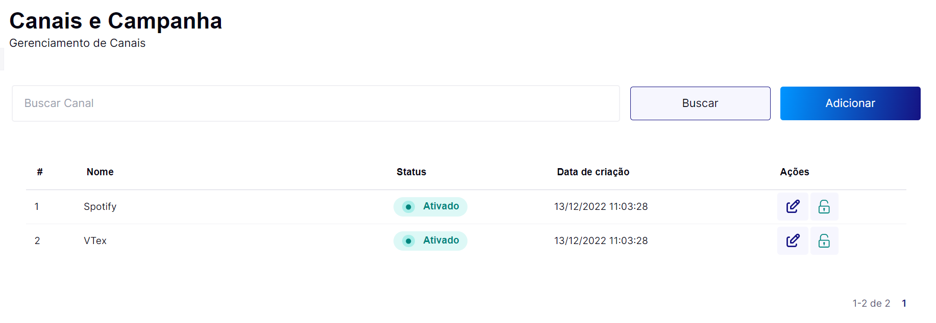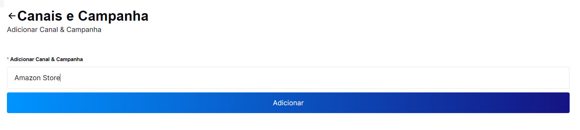 Clique em “Adicionar” para incluir um novo Canal ou Campanha.