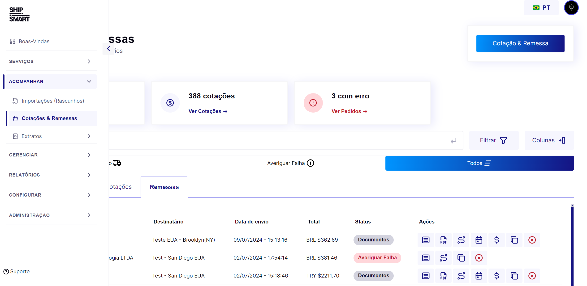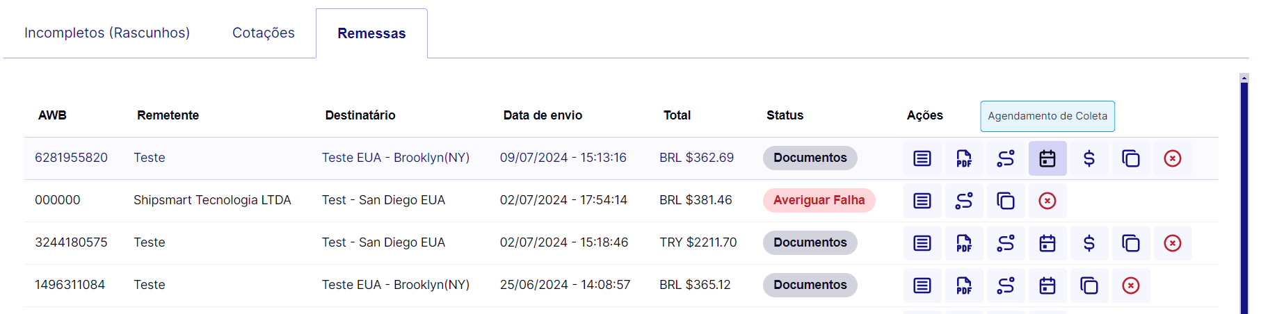 Na aba de Remessas, você encontrará uma lista de todas as remessas que você já realizou.