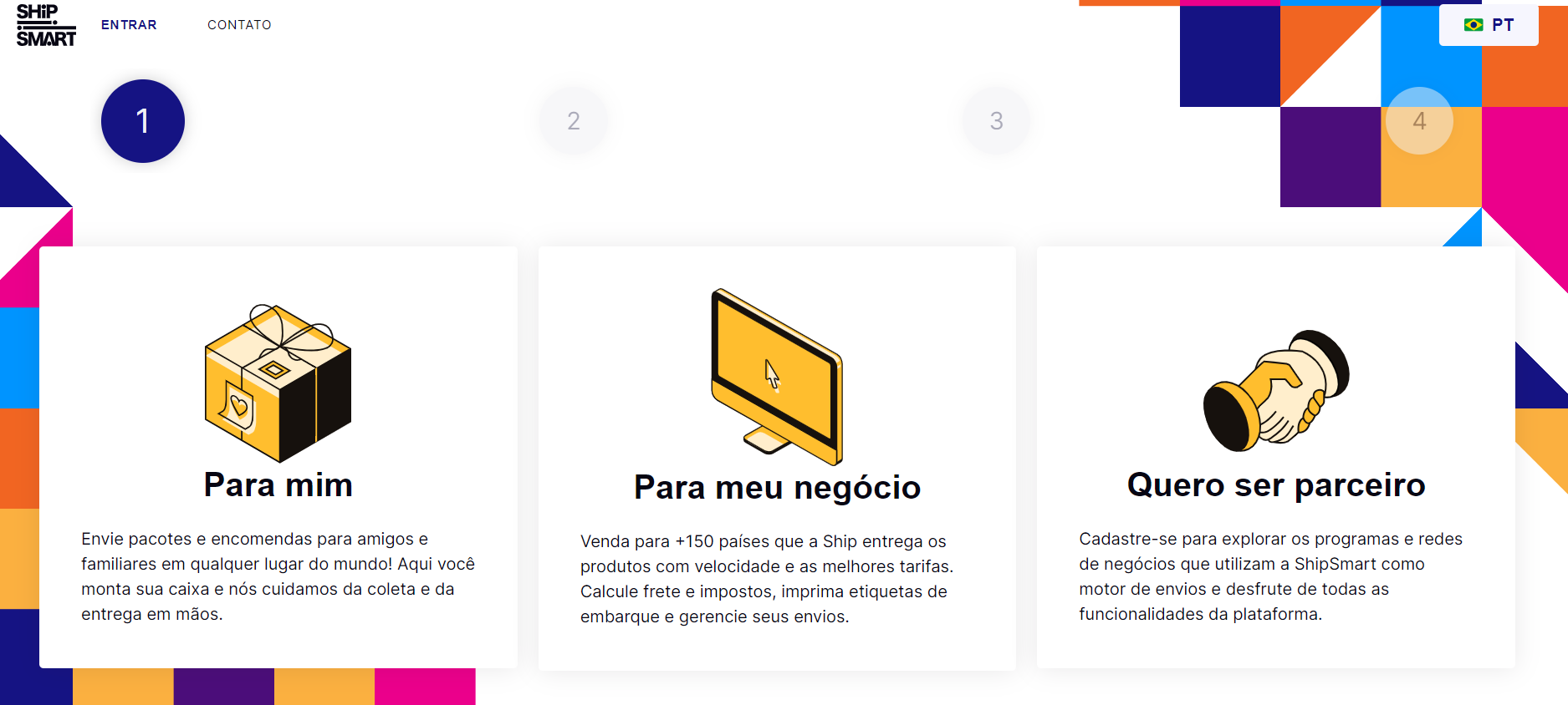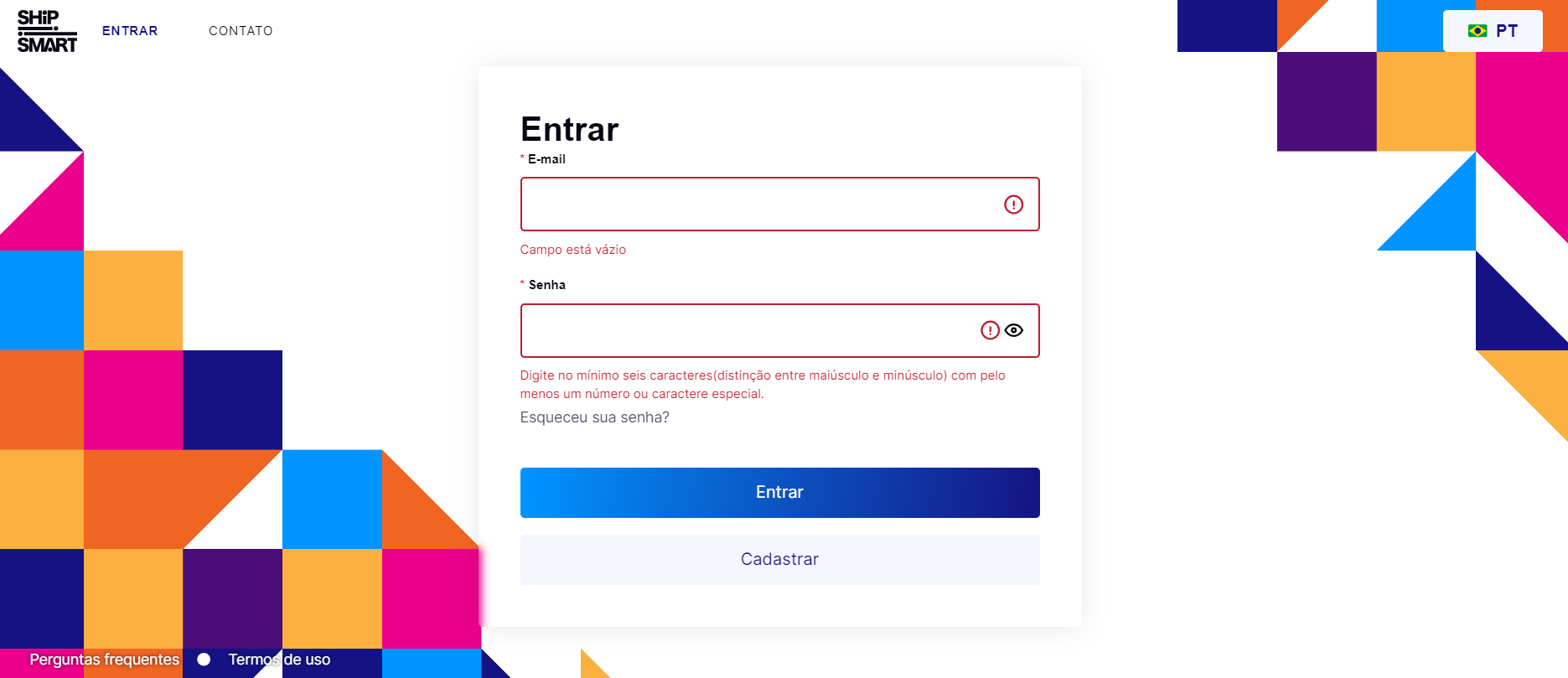 Para criar sua conta ShipSmart, clique em "Cadastrar".