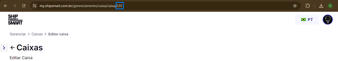 Código de caixa (Box_code) – verifique se é compatível com o ID presente na URL da janela de edição da caixa, como indicamos abaixo.