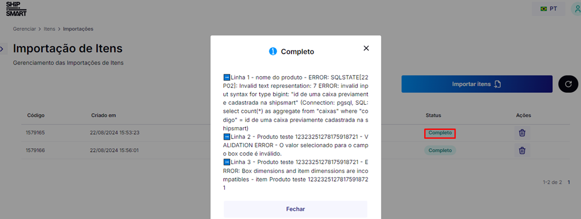 Se ocorrer algum erro, clique no texto do status para ver os detalhes e fazer ajustes no arquivo.