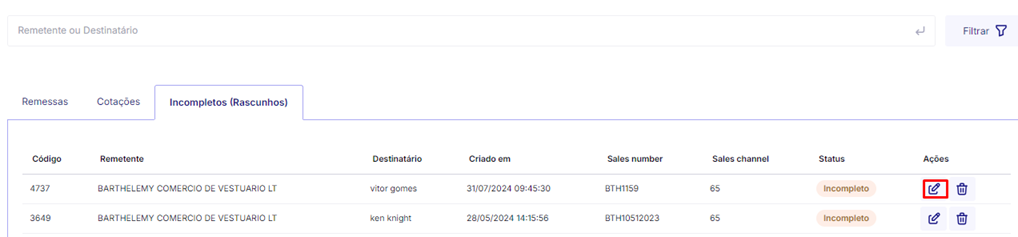Caso um pedido seja criado como rascunho por falta de informações, será necessário preencher os dados pendentes manualmente: